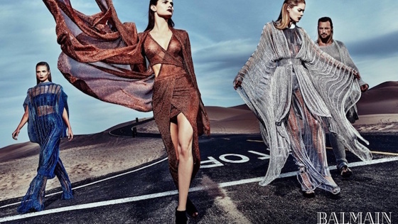 В осенне-зимней рекламной кампании Balmain, которая по совместительству была клипом Канье Уэста на композицию «Wolves», мы наблюдали эшелон топ-моделей во главе с Ким Кардашьян. В новом сезоне не обошлось без громких имен. Супермодели Изабель Фонтана, Наташа Поли и Даутцен Крез стали главными героинями весенне-летней коллекции. Автором ярких снимков стал фотограф Стивен Кляйн, который запечатлел именитых манекенщиц в сексуальных нарадях на фоне пустынной дороги.