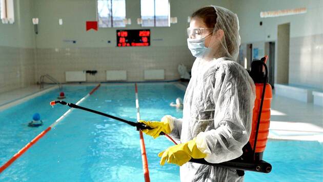 Путь спасателей лежит в главный зал, к бассейну с голубоватой водой. Сама вода уже обеззаражена — в спортивных бассейнах это и без угрозы коронавируса всегда было делом типичным. Девушкам осталось обезопасить дорожки, внешнюю часть бортиков, лестницы и скамейки вдоль бортов.