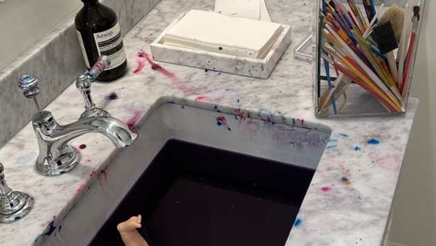 На снимке раковина до краев наполнена фиолетовой водой, в которой плавает кукла. Неподалеку стоит контейнер с карандашами и кистями, а столешницы и стены покрыты фиолетовыми, синими и розовыми брызгами. Даже зеркало Сторми не обошла своим вниманием и нарисовала на нем загадочные каракули — похоже, подпись художника. Ну а чем не инсталляция в лучших традициях бунтарей вроде Трейси Эмин и Дэмиена Херста?