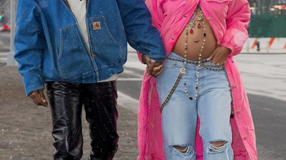 Певица — мастер эффектно преподнести новости о пополнении в семействе. Оба раза беременность знаменитости оказывалась полным сюрпризом для фанатов. О первой она сообщила внезапной прогулкой за руку с избранником A$AP Rocky по зимнему Нью-Йорку. На девушке был розовый пуховик, расстегнутый ниже груди, чтобы сомнений ни у кого не осталось. Разумеется, выход с оголенным животом запечатлел «случайный» уличный фотограф.