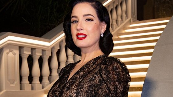 Сначала 51-летняя Дита фон Тиз предстала перед публикой в откровенном образе. Модель сняла бюстгальтер и продемонстрировала грудь. Танцовщица выступала в телесных стрингах в стразах, массивном колье, серьгах и браслетах. Визажисты сделали ей макияж с угольно-черными стрелками и красными губами, а стилисты по волосам — фирменную укладку. Звезда бурлеска сидела в гигантском бокале для коктейлей.