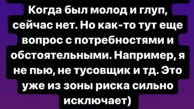 Рассуждая на тему измен в отношениях в запрещенной сети, Влад Кадони сделал шокирующее заявление. Экс-ведущего «Дома-2» спросили, способен ли он на измену своей девушке? «Когда-то давно был способен. Когда был молод и глуп. Сейчас нет. Но как-то тут еще вопрос с потребностями и обстоятельствами. Например, я не пью, не тусовщик и т.п. Это уже из зоны риска сильно исключает», — ответил Кадони. Но на этом не закончил свои размышления.