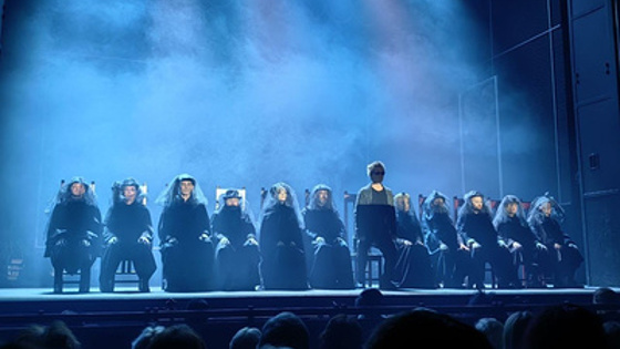 Оркестр расположился на своих местах, открылся занавес. Перед зрителями в голубой дымке предстали 12 человек. Лица 11 из них скрыты вуалью, и лишь главный герой — в солнечных очках.