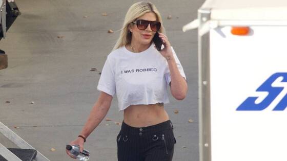 Звезду популярного телесериала «Беверли-Хиллз 90210» сфотографировали в кедах, черных брюках с низкой посадкой и белой укороченной футболке. На размещенных кадрах можно заметить, что на верхнем изделии присутствует надпись I was robbed («Меня ограбили»).