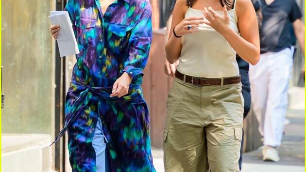 Во время перерыва актриса и её дочь вышли на прогулку. Кэти была в синем халате с принтом — очевидно, это был наряд для съёмок. Сури же выбрала для визита белый топ, бежевые брюки карго и яркие красные кроссовки.