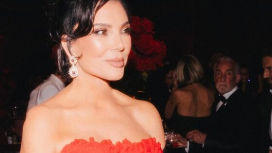 Сама именинница была в красном платье с оборками. Принца Гарри папарацци запечатлели в черном смокинге, а его супругу Меган – в обтягивающей водолазке и макси-юбке с глубоким вырезом.