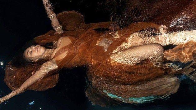 Для фотосессии Ким аккуратно убрала назад волосы и выбрала естественный макияж. На снимках она полностью погружается в воду, создавая впечатляющие кадры.