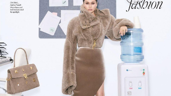 На обложке глянца Ляйсан предстала в роскошном образе, состоящем из элегантной асимметричной юбки с высоким разрезом, изысканной короткой шубы и замшевых туфель на каблуке от бренда Schiaparelli.