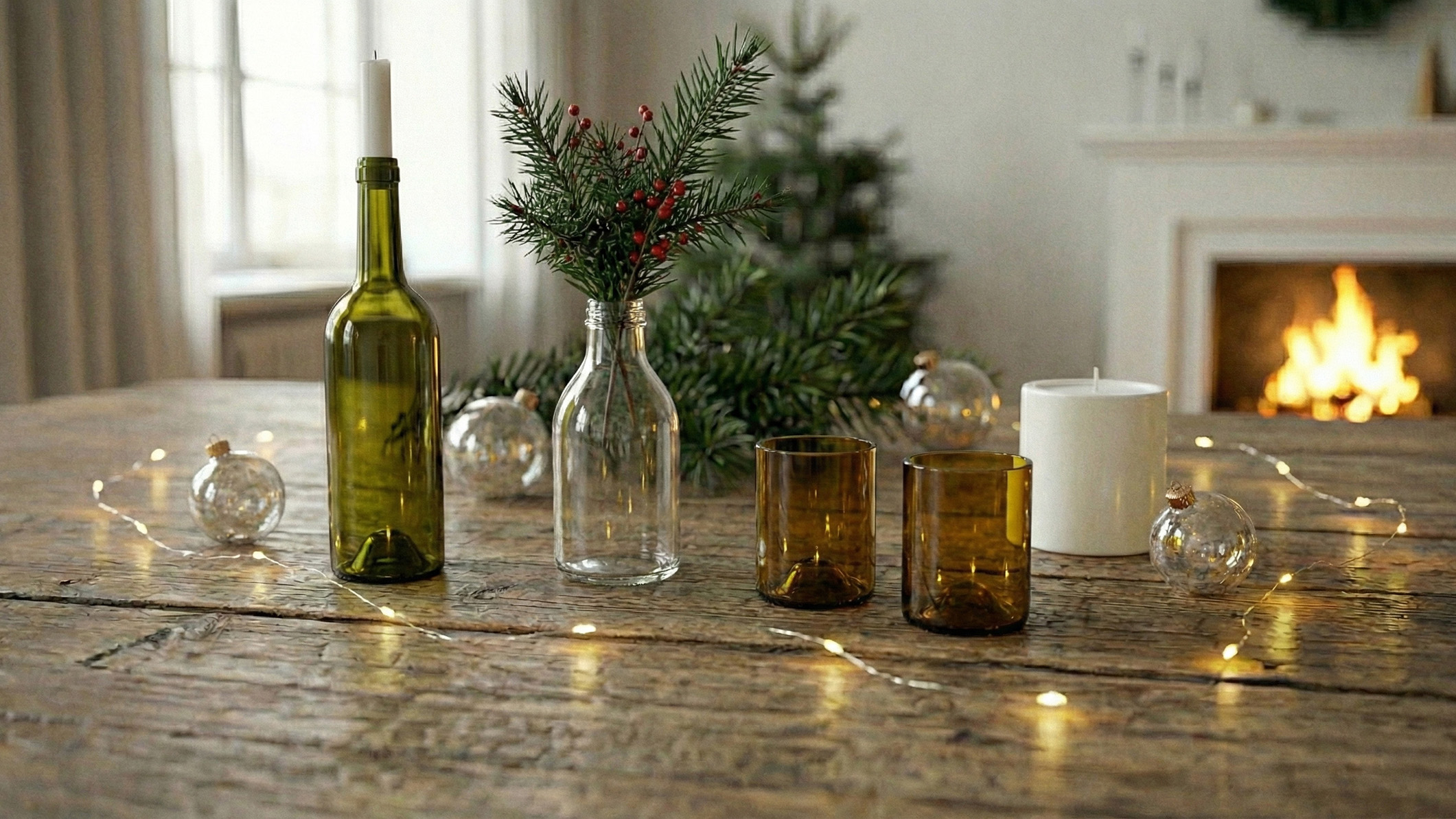 • подсвечник, ваза и стаканы из стеклянных бутылок;