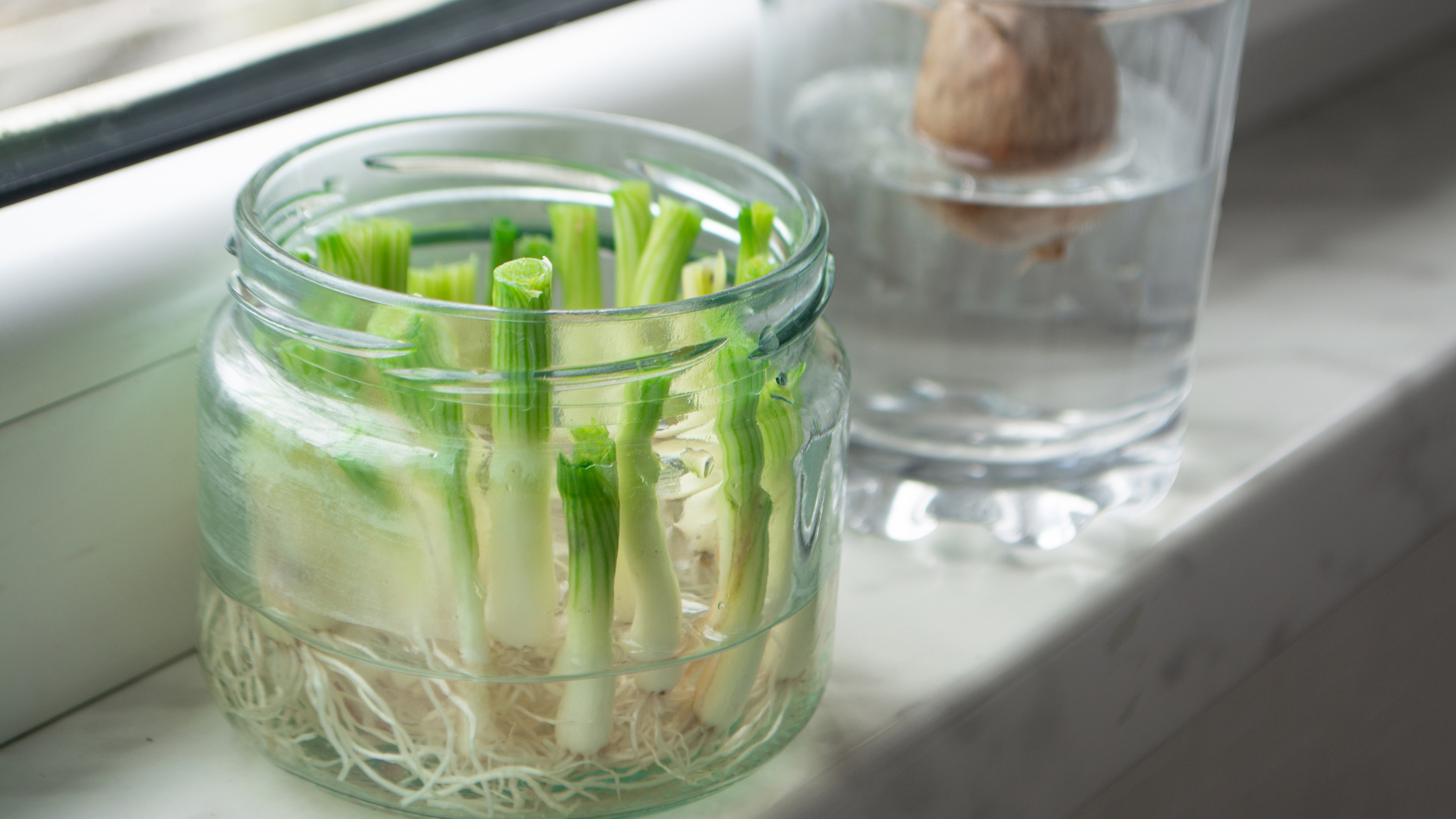 Если вы купили пучок зелёного лука с корешками, не выбрасывайте нижнюю часть. После срезки перьев оставьте примерно 3–4 см белой части с корешками. Поместите обрезки в ёмкость с водой и не забывайте освежать её раз в пару дней — это предотвратит загнивание. Буквально через полторы недели на столе появится свежая зелень собственного выращивания.