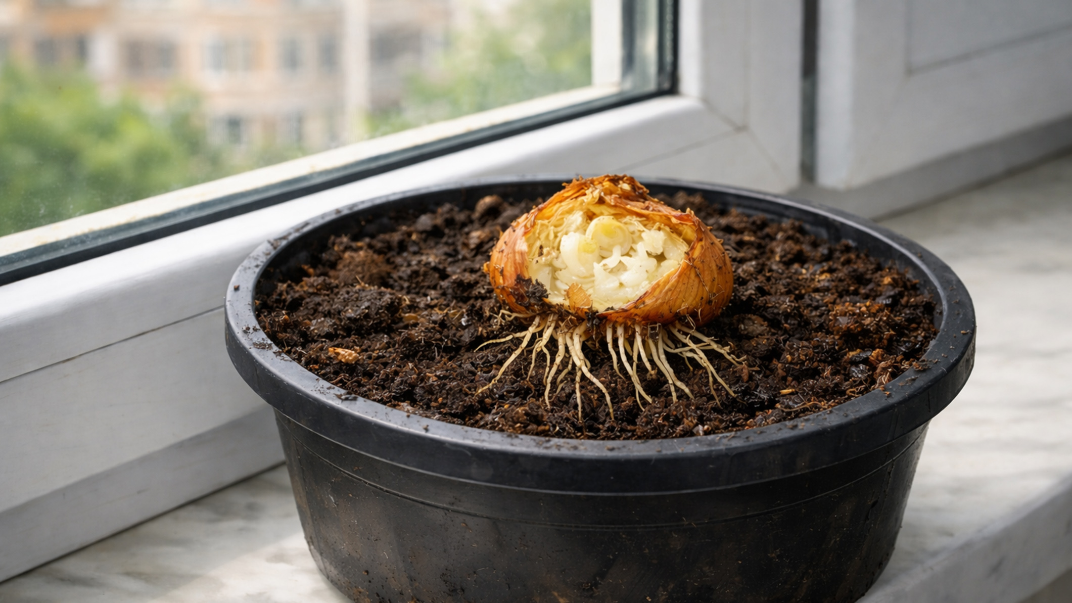 Чтобы получить зелёные перья лука, хватит всего лишь донца луковицы с корешками. Используйте сам овощ в готовке, а отрезанную корневую часть луковицы размером 2–3 см оставьте подсушиться на воздухе пару дней.