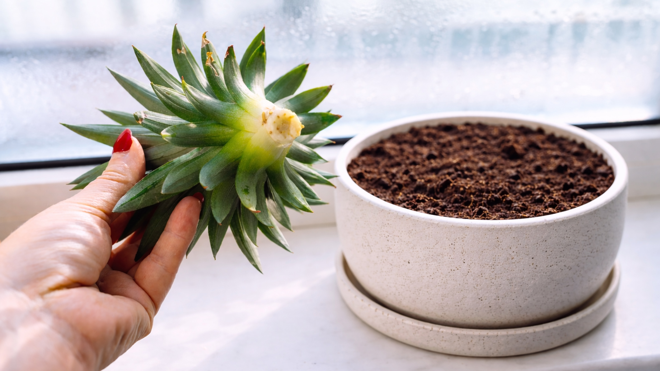 Возьмите верхушку ананаса и аккуратно открутите её от плода (не отрезайте). Удалите первые 3–5 слоёв листьев у основания, чтобы обнажить скрытые корешки. Посадите верхушку сразу в горшок диаметром 13–15 см с почвосмесью для пальм, заглубив только корневой конус (место, где был сам фрукт). Корни должны оставаться близко к поверхности.