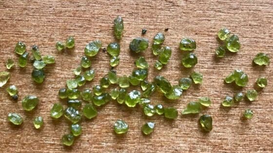 Эти кристаллы — оливины — магнезиально-железистые силикаты. Они настолько распространены на планете, что, по оценкам экспертов, составляют 50 процентов верхней мантии Земли. Во время извержения магма вымывает часть океанической коры, схожей по составу с мантией, поэтому темные магматические породы нередко приобретают зеленый оттенок. Однако в чистом виде оливин, который ювелиры обычно называют перидотом, найти трудно. Еще реже он падает с неба.