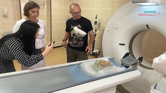 Исследователи обнаружили фрагмент плечевой кости крупного растительноядного динозавра и отправили находку в больницу города Мариинска, где расположен мультиспиральный высокоскоростной компьютерный томограф, который выдает снимки с отличным разрешением.