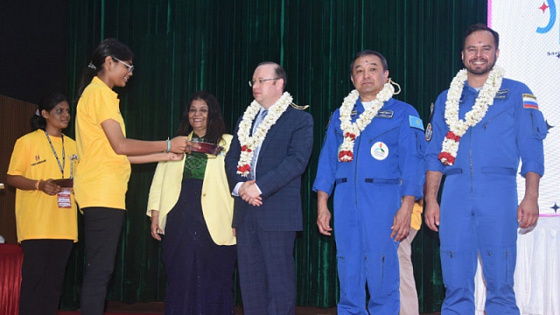 Российский и казахстанский космонавты Сергей Корсаков и Айдын Аимбетов посетили город Ченнаи в Индии, где состоялось награждение победителей ежегодного конкурса для школьников и студентов Young Scientist India.