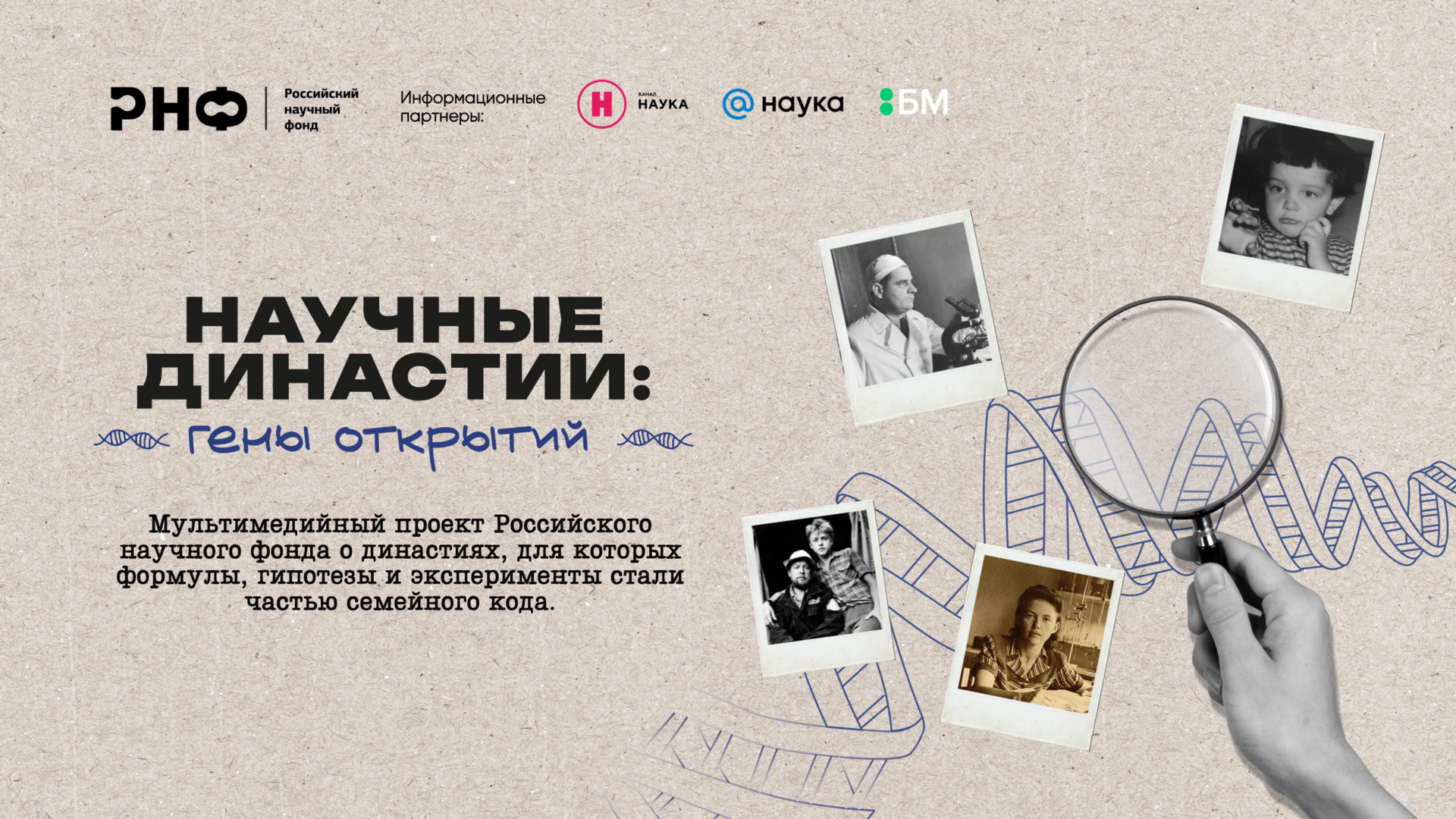 Российский научный фонд запускает мультимедийный проект «Научные династии: гены открытий» о семьях, для которых формулы, гипотезы и эксперименты стали частью семейного кода. Архивные фотографии и живые воспоминания, вплетенные в исторические события, позволяют по-новому взглянуть на прошлое и настоящее российской науки. Истории 12 семей, члены которых работают при поддержке РНФ, дают возможность проникнуться атмосферой науки, обычно скрытой от глаз общественности, — рассказы о подростковом бунте и первой любви, неудачах и радостях открытий, размышления о своем предназначении и беседы по работе за обеденным столом. Познакомиться с проектом можно на специальном сайте Фонда.