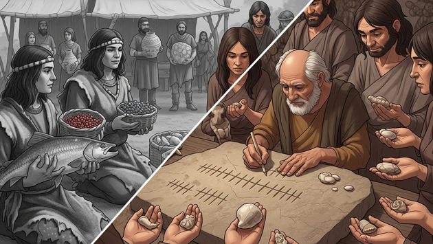 Экономисты любили приводить пример: обмен требует «двойного совпадения потребностей» — чтобы у тебя была рыба, которую я хочу, а у меня — топор, который нужен тебе. Из этого выводили необходимость в универсальном посреднике. Но палочки с зарубками показывают другое: деньги рождались не как «соль или золото для всех», а как инструмент учета долгов перед властью.