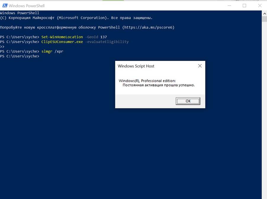Проверить, состоялась ли активация, также можно через PowerShell с помощью команды: