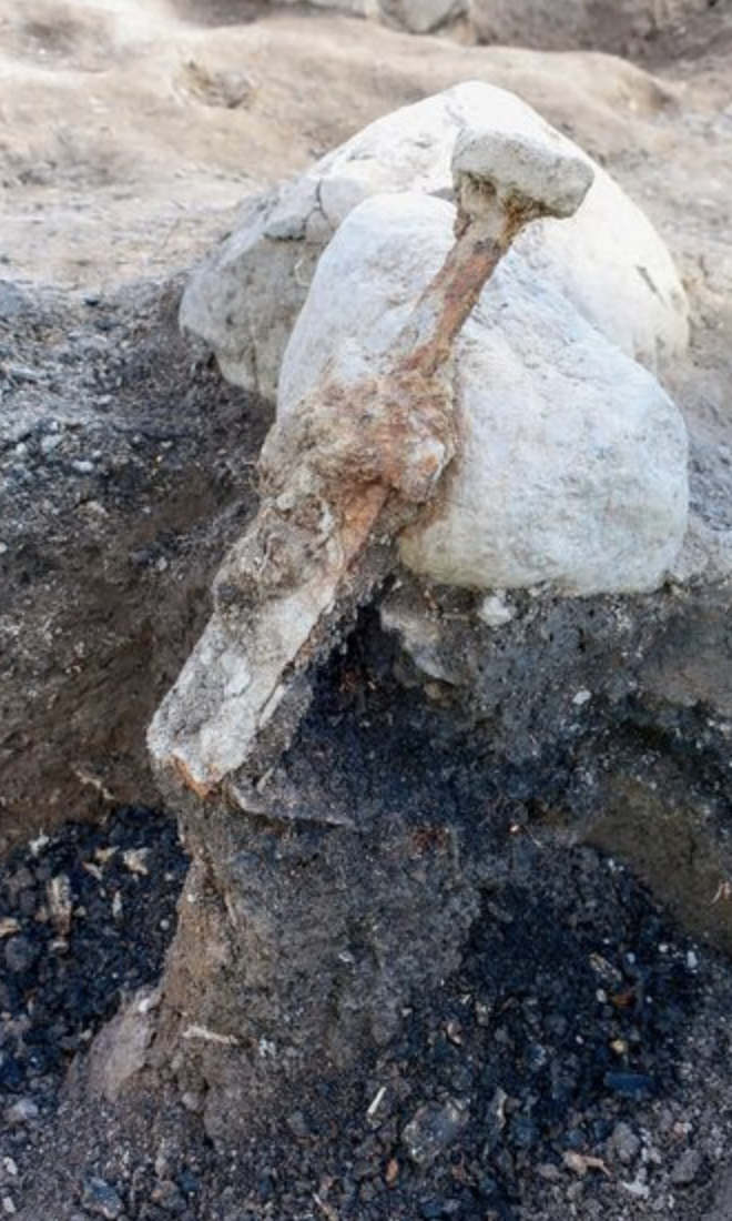 Особое внимание привлекает находка, где два меча стояли вертикально в более древнем кургане вендельского периода. Лезвия сломаны, что указывает на использование значительной силы при их установке.