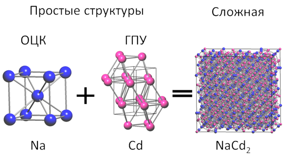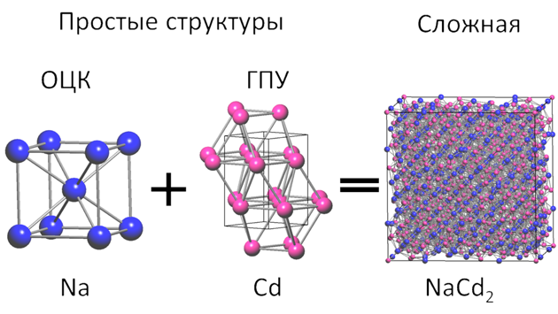 Согласно предложенной модели, именно в них при формировании интерметаллида встраиваются атомы другого металла. Таким образом, формирующаяся сложная структура из нескольких типов атомов сохраняет в себе черты более простой решетки исходного металла.
