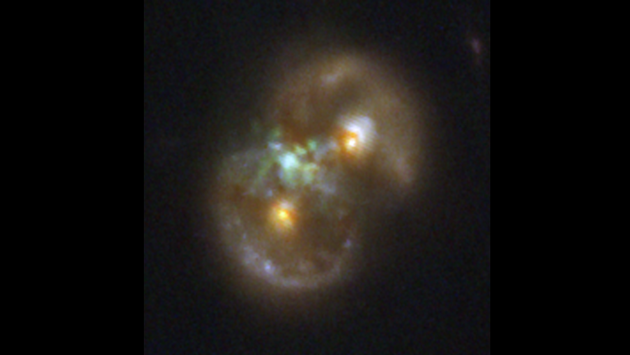 Две галактики, составляющие «Космическую сову», находятся на расстоянии около 9 миллиардов световых лет от нас. Слияния галактик — это распространенное явление, это может сделать выбросы сверхмассивных черных дыр не таким уж редким событием.
