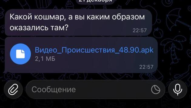 Полиция предупреждает, что преступники взламывают чужие аккаунты и с них отправляют сообщения с вредоносным файлом в формате —.apk СМС сопровождается вопросом: «Это ты на видео?» или текстом «Смотри, там на фото ты!» или, как в этом случае «Какой кошмар, а вы каким образом оказались там?». Беспечный человек думает, что пришла фотография и открывает ее. В этот момент вредоносный файл считывает уведомления, СМС и фотографии из галереи, а также может автоматически пересылать опасный файл всем контактам пользователя. - Злоумышленники пытаются получить доступ к платежным данным и использовать личную информацию в преступных схемах, - предупреждают полицейские. Важно знать: - apk - это не фото и не видео, а установочный файл; - такие рассылки часто идут уже со взломанных аккаунтов. Что делать: - не открывать ссылки и apk из чатов; - лучше напрямую позвонить собеседнику и уточнить, он ли это отправил; - удалить файл, пожаловаться и заблокировать отправителя; - предупредить знакомых, если сообщение пришло якобы от вас. Полицейские просят курян быть бдительными.