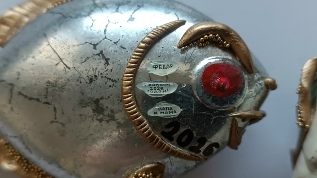 Так, на игрушке для жены прикреплены три рисовых зернышка с надписью: «Любимый Светик! С Новым 2026 годом! Твой Анискин». Стеклянные рыбки и шишки с микроминиатюрыми поздравлениями от мамы и папы также достались сыновьям.