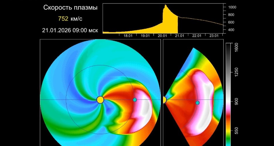 Плазменное облако выглядит как расширяющийся газовый шар, летящий на наблюдателя. Для понимания масштабов — Солнце в центре имеет размер 1,5 млн километров в диаметре, Земля — маленький зеленый кружок справа от Солнца. Дополнительное изображение — вид сбоку на Землю. Предварительное время прихода плазменного облака — полдень 20 января по московскому времени.
