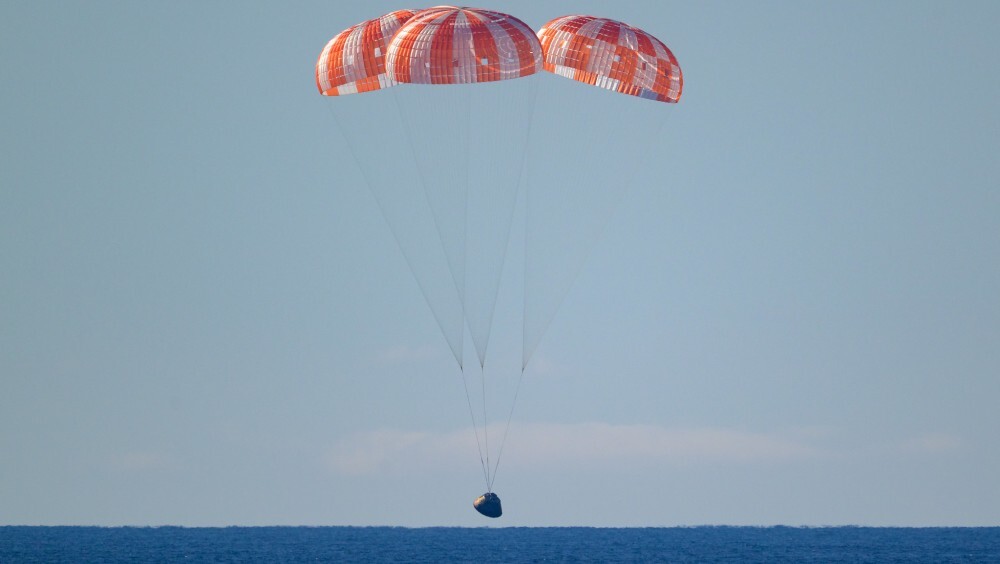 Теплозащита выдержала испытание, и корабль мягко опустился на воду под куполами трех основных парашютов. Как заявили в НАСА, вход в атмосферу прошел максимально гладко, поскольку «Орион» и его системы выполнили свою задачу в точности. После напряженных шести минут радиопомех, в течение которых капсулу окутывало облако перегретой плазмы, «Орион» оказался в безопасности на почти безоблачном небе.