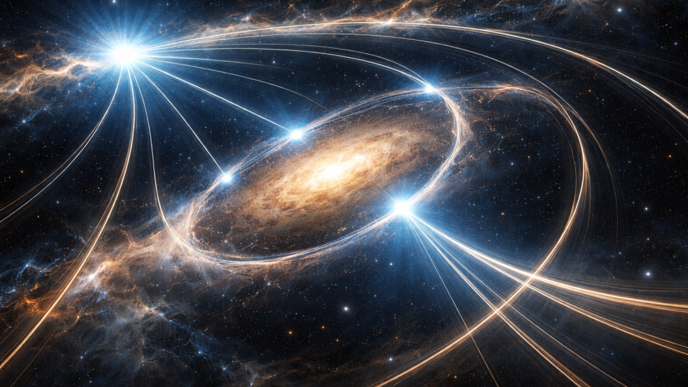 Гравитационная линза получается, когда массивное космическое тело (галактика, скопление галактик или черная дыра) своим гравитационным полем искривляет направление света точно так же, как обычная стеклянная линза. Согласно Эйнштейну, массивная материя прогибает ткань пространства-времени. Фотоны от далекого фонового объекта (например, квазара или сверхновой) движутся по этим «прогибам». Вместо того чтобы лететь прямо, свет огибает массивный объект и фокусируется в сторону наблюдателя (Земли). Линза работает как природный «телескоп», позволяя увидеть объекты, которые слишком тусклы для обычных приборов. Один и тот же объект может выглядеть как несколько точек. Из-за разных путей обхода линзы свет от одного изображения может прийти на несколько недель или месяцев позже другого.