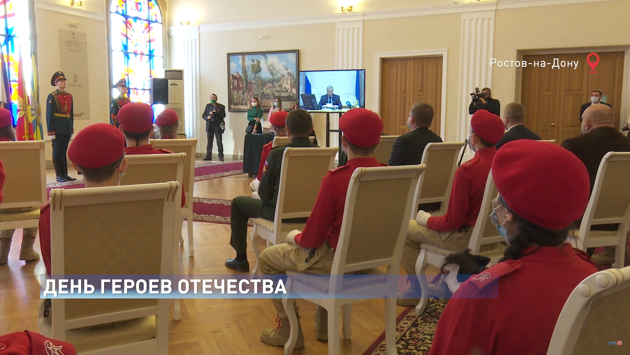 Ростовская область, 9 декабря 2020. Телеканал «ДОН 24». Командир юнармейского отряда "Октябрьский резерв" Сергей Шереметьев мечтает поступить в военное училище на инженерно-техническую специальность. Основы военного дела школьник уже знает - изучает в Юнармии. А еще активно участвует в соревнованиях по военному многоборью, военно-спортивных играх, патриотических событиях. И успешно: сегодня получает Кубок за первое место в смотре-конкурсе Юнармии по ЮФО. Кубок лидера вдвойне почетно получить из рук Героя России. Генерал-лейтенант Валерий Горбенко с детства мечтал о небе - и дослужился до командующего четвертой армией ВВС и ПВО. Звание Героя получил в ходе контр-террористической операции на Северном Кавказе. А раньше воевал в Афганистане. Летчик Борис Ковзан из Шахт единственный за годы войны совершил 4 воздушных тарана - и остался жив. Получил звание Герой Советского Союза. Десантник Псковской дивизии ростовчанин Дмитрий Петров погиб в Аргунском ущелье. Он Герой России посмертно... Отвечая на вопросы юнармейцев, Василий Голубев рассказал о подвигах, которые его особенно впечатлили. 13 жителей региона стали Героями России. И интерес к их подвигам, военной истории велик. Василий Голубев рассказал, как будет развиваться парк Патриот на Самбекских высотах. Уже в следующем году в парке создадут кластеры сухопутных войск и воздушно-космических сил.