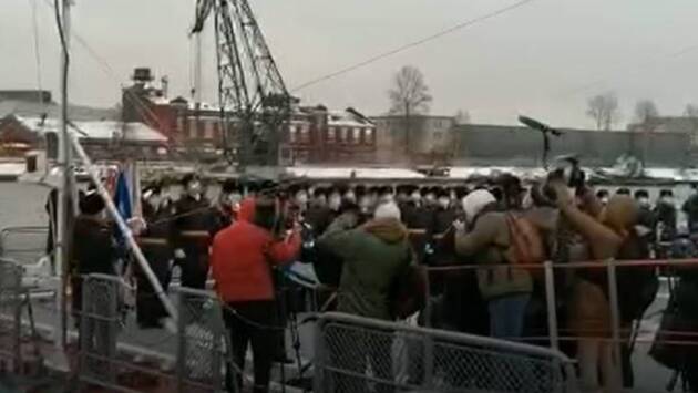 «Флаг, гюйс, флаги расцвечивания — поднять», - звучит команда командира корабля капитана 2-го ранга Олега Потапова. Флаги начинают подниматься, оркестр играет музыку, а оператор петербургского телеканала «Город+» соскальзывает за палубу корабля прямиком в ледяную воду.