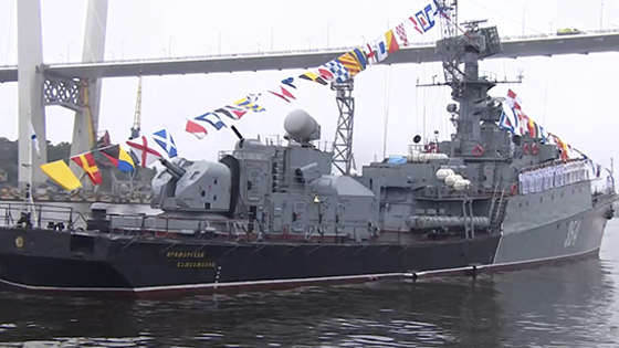 Командующий Тихоокеанским флотом (ТОФ) адмирал Сергей Авакянц на катере «Ураган» обошёл парадный строй и поздравил каждый экипаж боевого корабля с профессиональным праздником.