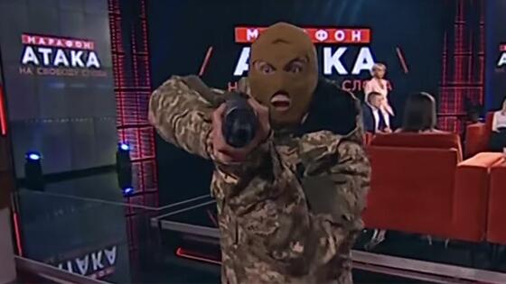 Украинский телеканал буквально на одну минуту «захватили» трое неизвестных в масках и камуфляже. Они неожиданно ворвались в студию во время ток-шоу «Атака на свободу слова». Размахивая оружием, мужчины бегали по студии и требовали, чтобы все сидели на своих местах. Если гости и ведущие поняли, что это шутка, то массовка попряталась под трибуны.