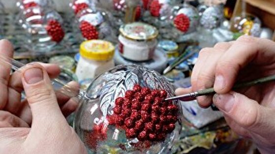 Стеклянные шары расписаны крысами-снегурочками, крысами с сыром, мышками-Санта-Клаусами. Цена маленького нарядного шара — 30 гривен (80 руб.), игрушки побольше — 55 грн (145 руб.). Тем не менее, большинство елочных игрушек на украинских прилавках китайского производства. Вкусы украинцев на правом и левом берегах Днепра, как утверждают маркетологи, несколько отличаются. На востоке отдают предпочтение более традиционным и одноцветным новогодним шарам — красным, синим, зеленым. Жителям западных областей больше нравятся разноцветные и обильно украшенные украшения, сложные цвета, перламутр. Иностранцы вообще отдают предпочтение неожиданным оттенкам и новым формам: домикам, автомобилям, героям современных мультфильмов. Также немного по-разному относятся украинцы и к стоимости украшений. По наблюдениям специалистов отрасли, жители западных регионов более склонны покупать дорогие стеклянные шары украинского производства, тогда как в других областях жители более экономны, поэтому там преобладает спрос на пластиковые игрушки из Китая. Украина свои елочные игрушки массово отправляет на экспорт. Основным покупателем на сегодня является Евросоюз. За последние годы Украина стремительно набрала популярность среди европейских потребителей как производитель стеклянных рождественских украшений. Соотношение хорошего качества и умеренной цены обеспечило украинским производителям устойчивый спрос на их товар. И хотя украинскими игрушками украшены елки в США, Израиле и даже на Мальдивах, сама Украина массово импортирует китайские новогодние украшения. Основные производители — на западе К сожалению, точной статистики по количеству елочных украшений, которые производятся на Украине, нет. Во-первых, каждый производитель подсчитывает собственные успехи. Во-вторых, статистические службы не имеют специально выделенного кода для этой группы товаров: производители новогодних украшений работают по КВЭД 32.40 «Производство игр и игрушек». По оценкам экспертов, речь может идти о полумиллионе и более игрушек в год. Правда, еще в 2011 году компания «Орбитал», которая является владельцем Теребовлянского завода ёлочных украшений, сообщала, что за год изготовила около миллиона игрушек. К примеру, украинское частное предприятие по производству елочных игрушек в Клавдиево в предновогодний период производит от 2 до 10 тыс. штук каждый день. Учитывая, что сейчас в стране работают примерно полдесятка подобных, достаточно больших, и еще несколько мелких фабрик, можно предположить, что речь идет о сотнях тысяч или миллионах игрушек, которые изготавливают и продают внутри страны и за ее пределами украинские стеклодувные фабрики. Среди основных производителей стеклянных новогодних игрушек, которые достаточно успешно на протяжении многих лет импортируют свою продукцию в Европу и ближнее зарубежье, можно выделить ООО «Галимпекс», ООО «Ирэна» и несколько физических лиц — частных предпринимателей. Интересно, что большинство производителей находятся в западных областях страны. Кроме «Орбит» с Тернопольщины регион представляют также ивано-франковская «Юрита» и львовский «Галимпекс». «Галимпекс» — крупнейший производитель и экспортер стеклянных новогодних игрушек на Украине, поскольку ему принадлежат также Клавдиевская фабрика елочных украшений на