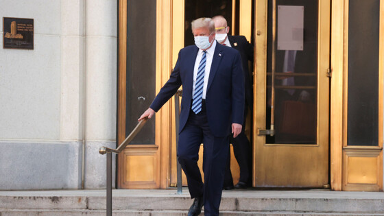 Отмечается, что Трамп покинул здание больницы в медицинской маске и в сопровождении охраны.