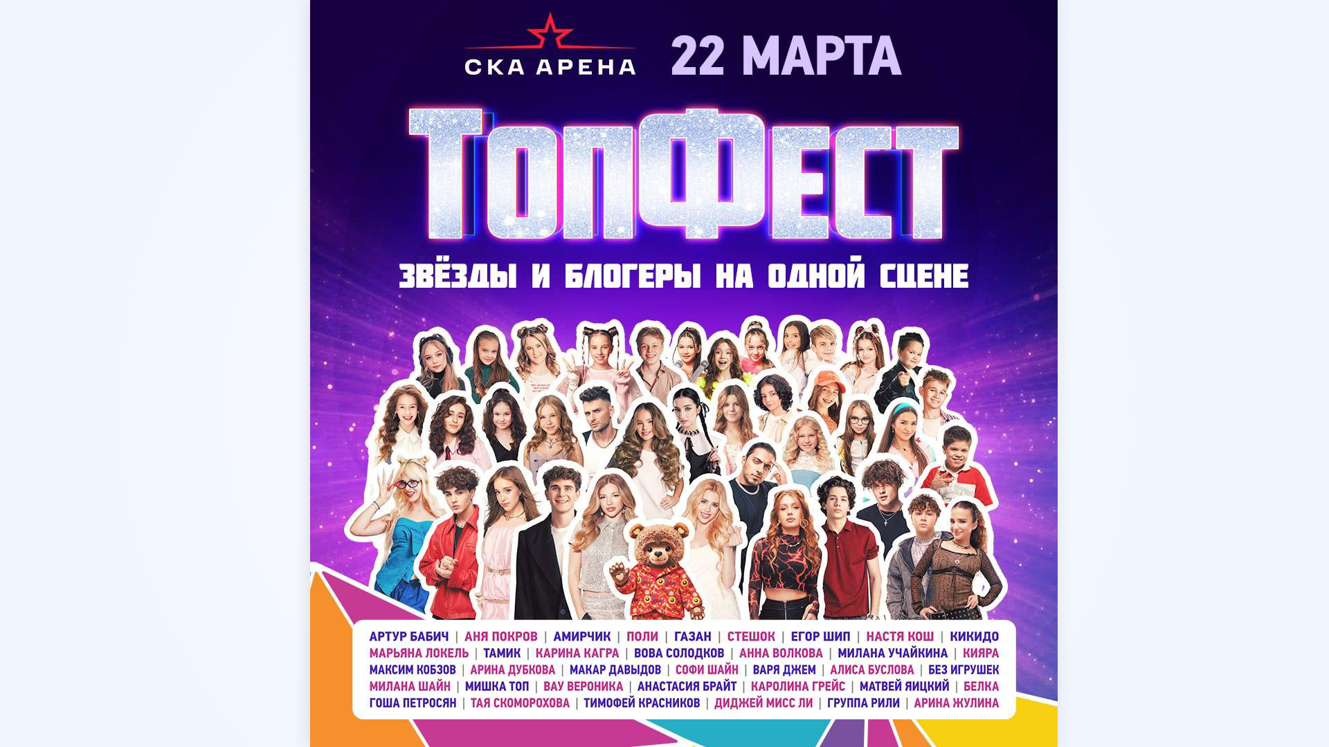 22 марта в петербургском СКА «Арена» пройдёт «ТопФест» — масштабный фестиваль, где выступят десятки популярных блогеров и молодых артистов: Амирчик, Егор Шип, Аня Pokrov, Милана Шайн, Варя Джем и многие другие. Организатор фестиваля — «Институт поддержки детского блогинга», просветительская площадка для родителей и юных талантов.