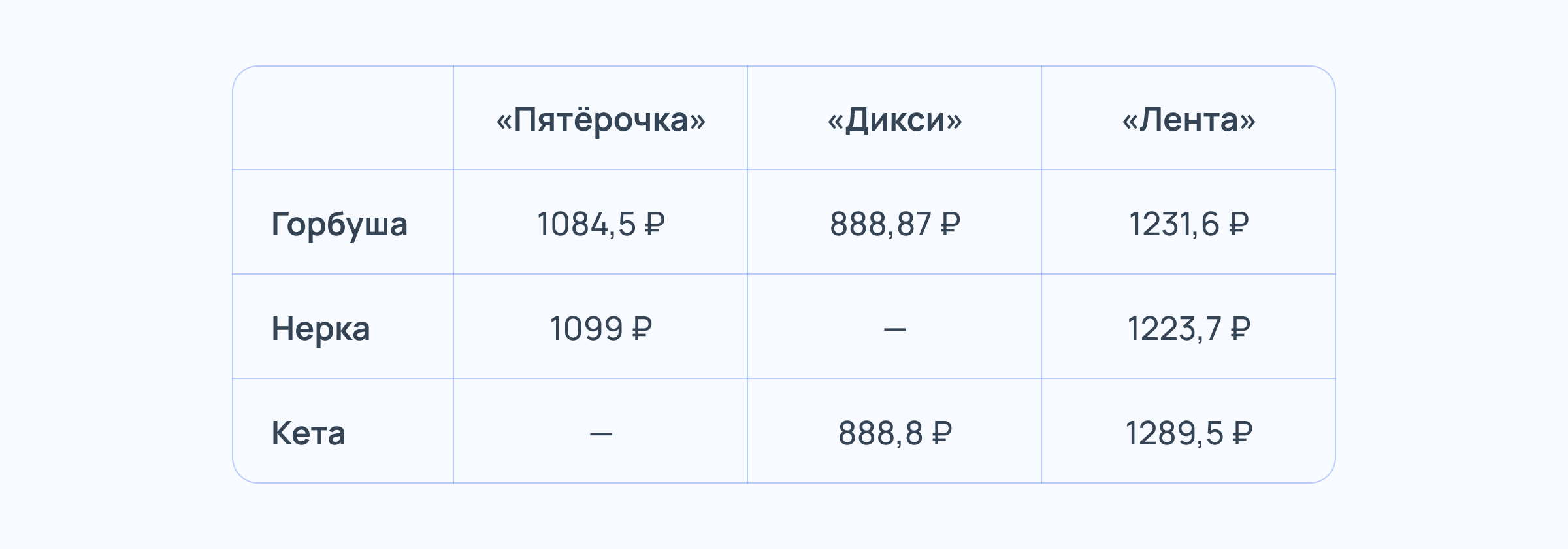 Самые низкие средние цены на 100 граммов натуральной красной икры — в «Дикси» (888,77 рубля). На втором месте «Пятёрочка» (1091,77 рубля), на третьем — «Лента» (1260,53 рубля). Как мы видим, стоимость икры не сильно отличается в зависимости от вида рыбы: горбуша, кета или нерка.
