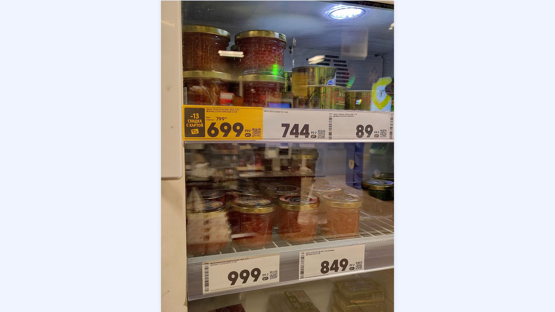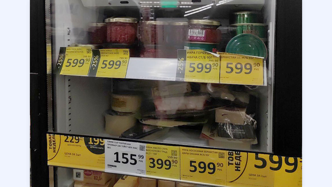 Цены на икру в «Ленте» намного выгоднее с картой лояльности. Скидки начинаются от 15% и доходят до 52%. Стоимость икры в офлайн-магазине соответствовала цене, указанной в онлайн-каталоге, убедилась корреспондент «Рамблера». При личном посещении магазина найден наиболее выгодный вариант — лососёвая икра «Путина», зернистая, объёмом 95 граммов за 499 рублей по карте лояльности.