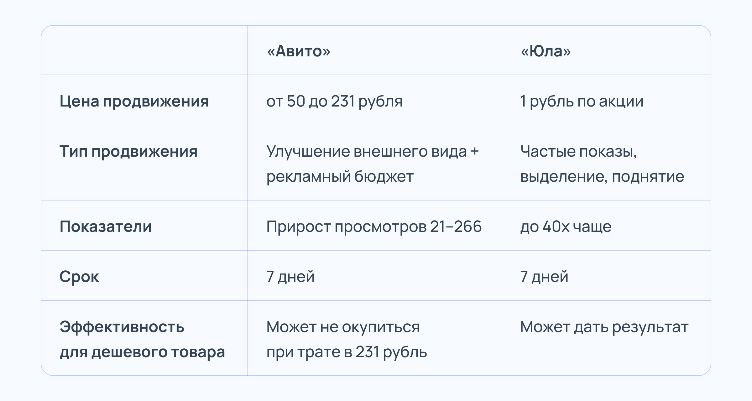 Сравнение возможностей для пользователя «Авито» и «Юлы» (с учётом акций на продвижение)