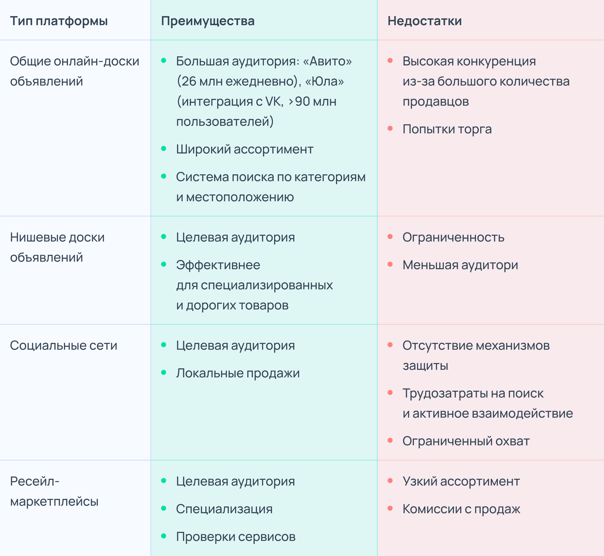 Соцсети дают возможность найти более узкую целевую аудиторию. По этой причине они больше подходят для локальных продаж и нишевых товаров. Тем не менее здесь риски выше: нет защиты сделок и безопасной доставки, а успех сделки зависит от добросовестности обеих сторон.