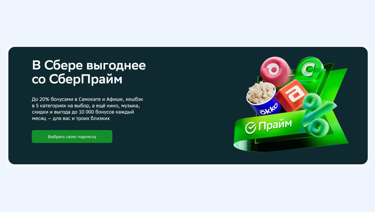 СберПрайм подойдёт для всех перечисленных категорий. Это универсальная подписка для клиентов Сбера, которые хотят получать максимум выгоды при использовании услуг банка, а также слушать музыку и смотреть кино на партнёрских платформах — Okko и Звук, выгоду в виде кешбэка в Самокате, Купере и Мегамаркете.