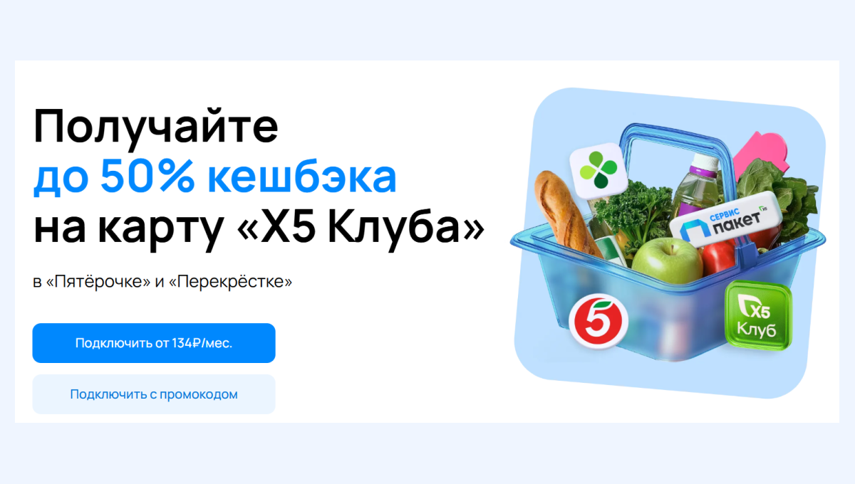- Кешбэк 5% и по 3 бесплатных доставки покупок из «Пятёрочки» и «Перекрёстка».