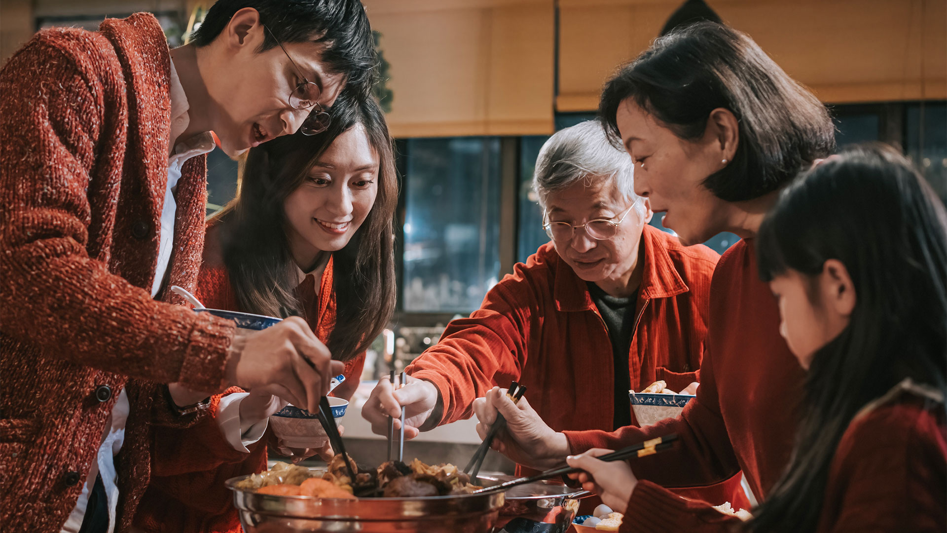 За праздничным столом обязательно собирается вся семья. Традиционное блюдо — цзяоцзы (пельмени), чья форма напоминает старинные слитки серебра и символизирует богатство. Рыба на столе гарантирует достаток, а сладкие рисовые шарики танъюань — крепкие отношения в семье.