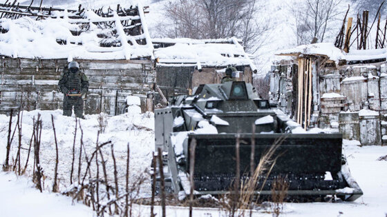 По легенде учений, в Грушевом засели террористы - за рвом мелькали фигуры в спортивных куртках, изредка постреливая в нашу сторону. К преграде подошел боевой дозор: саперы в защитных костюмах, похожих на космические скафандры, сканировали дорогу миноискателями, над их головами водил стволом пушки БТР, за ним угрюмо целились в деревню два танка. Террористы притихли. Саперы закончили проверку дороги, старший подал знак: можно идти.