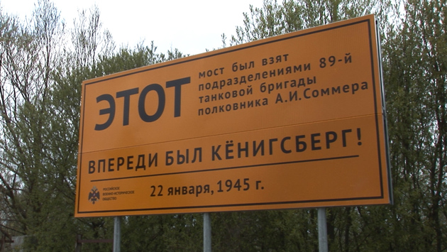 -Впереди был Кёнигсберг. Информационный стенд, рассказывающий о подвиге танковой бригады полковника Соммера, установлен на левом берегу реки Преголи.