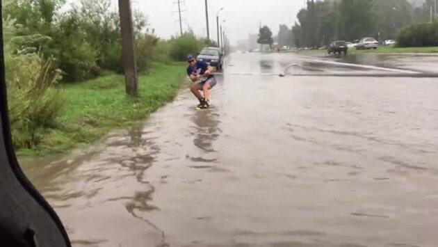 Станислав Егоров прокатился по затопленной после проливных дождей псковской Инженерной улице. Экстремал даже сумел выполнить несколько базовых трюков. На прошлой неделе в Пскове за один день выпала почти месячная норма осадков.