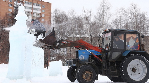Пилой и трактором: как в Ижевске разбирают ледовый городок на Центральной площади