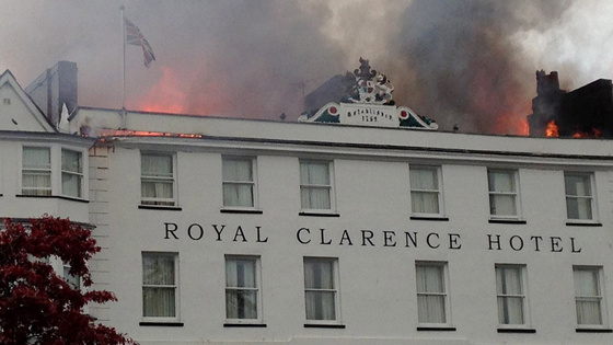 Пожар начался накануне утром. Сначала загорелся бывший постоялый двор XVIII века. С него огонь перекинулся на старинный отель Royal Clarence. Он является самым древним в стране.Уцелела только фасадная стена отеля. Однако инженеры говорят, что вскоре она также обрушится из-за повреждения конструкции. Сейчас пламя удалось локализовать. Огонь тушили более сотни пожарных, но спасти квартал им не удалось. Пострадавших в ходе инцидента нет, поскольку жильцы были вовремя эвакуированы. Причины пожара пока не известны.Royal Clarence был построен в 1769 году и стал первым в Англии зданием, официально получившим статус отеля. В 1827 году его реконструировали. Постояльцами отеля были адмирал Горацио Нельсон, актеры Гэри Купер и Кларк Гейбл, а композитор Ференц Лист давал в отеле концерты для аристократов.