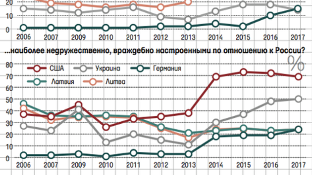 Число россиян, называющих Украину среди наиболее враждебно настроенных к России стран, достигло максимума за все время исследований – по данным «Левада-центра», так считает половина опрошенных против 30% в 2014 г. (см. график). Главным врагом остаются США, но у них тренд нисходящий. Турция, вошедшая в 2016 г. в первую «вражескую» тройку с 29%, теперь лишь 11-я (8%), а ее место заняла Германия. В пятерке лучших друзей по 5 процентных пунктов за год прибавили Китай и Сирия, три других традиционных союзника потеряли по 4–5 пунктов. За два года заметно (с 54 до 46%) сократилось число россиян, считающих, что Россия находится в международной изоляции, но еще сильнее (с 58 до 44%) снизилось количество тех, кого это беспокоит. При этом за последний год почти в 2 раза (с 12 до 21%) выросло число респондентов, полагающих, что отношения с США меняются в лучшую сторону, однако с 49 до 54% возросло и количество тех, кто не видит изменений в российско-американских отношениях. Конфликт с Украиной продолжается, накал претензий не спадает, на этом фоне продолжается конфликт с Западом, перечисляет замдиректора «Левада-центра» Алексей Гражданкин: «Каждый месяц не обходится без инициатив украинской власти, которые воспринимаются как антироссийские. Вражда вызвана нынешней ситуацией, чем дольше она будет длиться, тем сложнее из нее будет выходить». Отношение к стране зависит от политики ее властей, отношение к населению всегда более положительное, оговаривается социолог, но эти кривые все-таки колеблются согласованно: если ухудшается отношение к государству, то и к жителям тоже. При этом в отношении к странам есть некая ситуативность, отмечает Гражданкин: «Возникает конфликт – например, бомбардировки Югославии, вторжение в Ирак, конфликт в Южной Осетии – и происходит резкое ухудшение отношений. Но как только конфликт преодолен, то отношения восстанавливаются». Происходит привыкание к изоляции, а ожидания от нового руководства США, которые улучшили отношение к стране, развеиваются, добавляет он. Украина может обогнать США в списке врагов, если Дональд Трамп сильно пойдет навстречу России и это найдет отражение на российских каналах, считает политолог Алексей Макаркин: «Ключевую роль играет телевидение, которое дает норму отношения к той или иной стране, эта норма может корректироваться. Россияне больше доверяют не людям, которые только что приехали из Киева, а телевидению». Отношение к США формируется за счет информации по телевидению, что «Трамп, может, и хороший, но элиты не позволяют ему проводить его политику», отмечает эксперт: «С Турцией произошел серьезный разворот: это не проблема сбитого самолета, которая задевала чувства, а проблема помидоров – экономическая». Об Украине же российское телевидение не забывает, добавляет Макаркин: «Вот переименовали в Киеве проспект Ватутина в проспект Шухевича – таких элементов много, и каждый становится предметом серьезного внимания. Россияне же считают, что в этом конфликте они не виноваты, что Крым был и так свой, что в Луганске защищали своих – т. е. это обида, помноженная на ощущение несправедливости. Причем все это постоянно актуализируется новыми информповодами и приводит к тому, что раны, которые могли бы заживать, постоянно расчесываются».